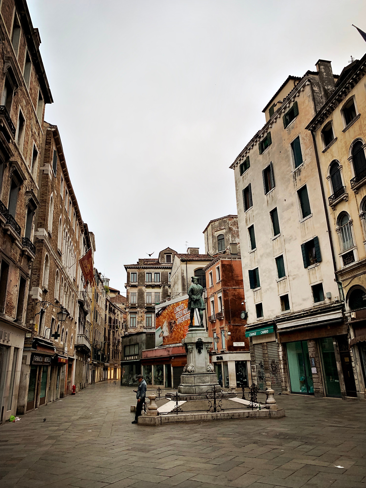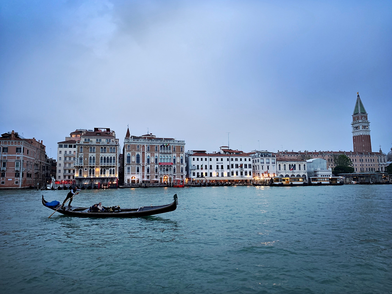 그 앞에서 보면 건너편의 산 마르코 광장의 모습이 보인다. 사람들이 많이 없어서 여유 있게 바다를 바라보았다. 하늘은 점점 푸른색으로 변하고 상점에서는 하나씩 불이 켜지기 시작하는 가운데 곤돌라 한대가 유유히 내 앞을 지나간다.
