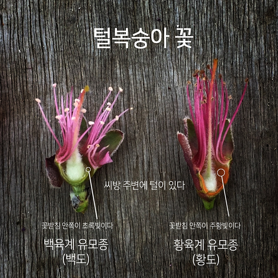 복숭아는 크게 털이 있는 유모종(有毛種)과 털이 없는 무모종(無毛種)으로 구분합니다. 무모종은 천도복숭아를 생각하시면 이해가 빠를 겁니다. 그래서 복숭아를 재배하는 농민들은 천도복숭아를 '뺀질이'라고 부릅니다. 또한 과육의 색에 따라 백육계와 황육계로 구분을 합니다. 백도는 백육계 유모종이고 황도는 황육계 유모종입니다. 천도복숭아는 대부분 황육계 무모종이고 '신비'와 같이 과육이 하얀 천도는 백육계 무모종이 되겠죠?
