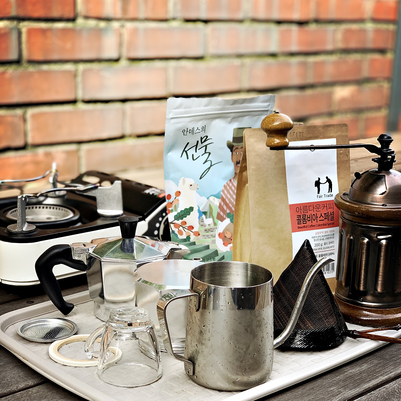 공카페 오픈 소식을 SNS를 통해서 보시곤 평소 알고 지내는 공정무역 '아름다운커피' 사무처장님(우윳빛깔 한수정)께서 커피를 후원해 주셨습니다. 모카포트용 분쇄 원두 외에 일반 원두도 같이 보내주셨습니다. 모카포트에는 곱게 분쇄된 커피만 쓸 수 있어서 일반 원두를 어디에 쓸까 고민하다 집에서 한 동안 잠자고 있던 마미체가 떠올랐습니다. 핸드 드립 커피는 이렇게 공카페의 메뉴에 추가 되었습니다.