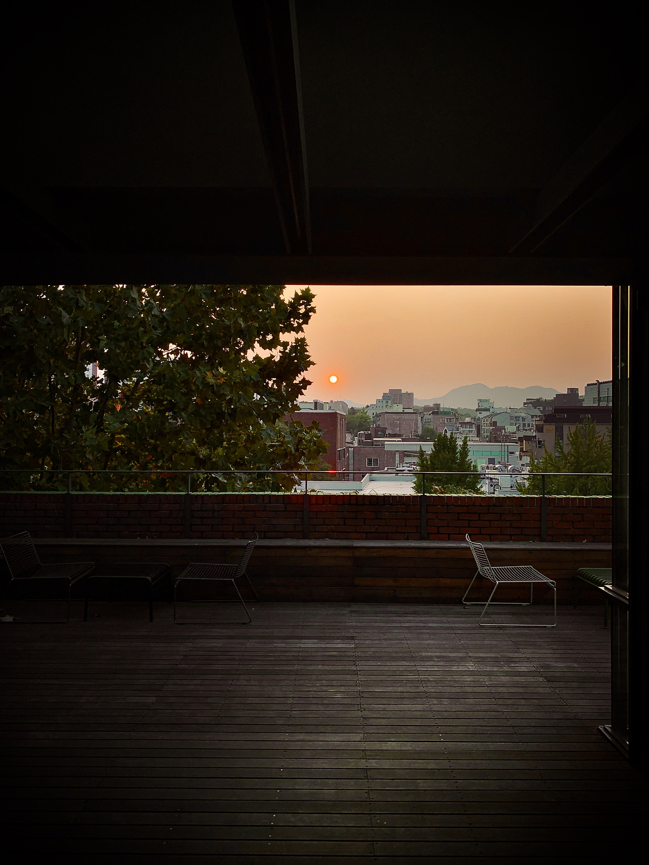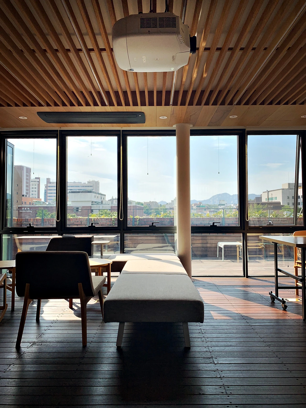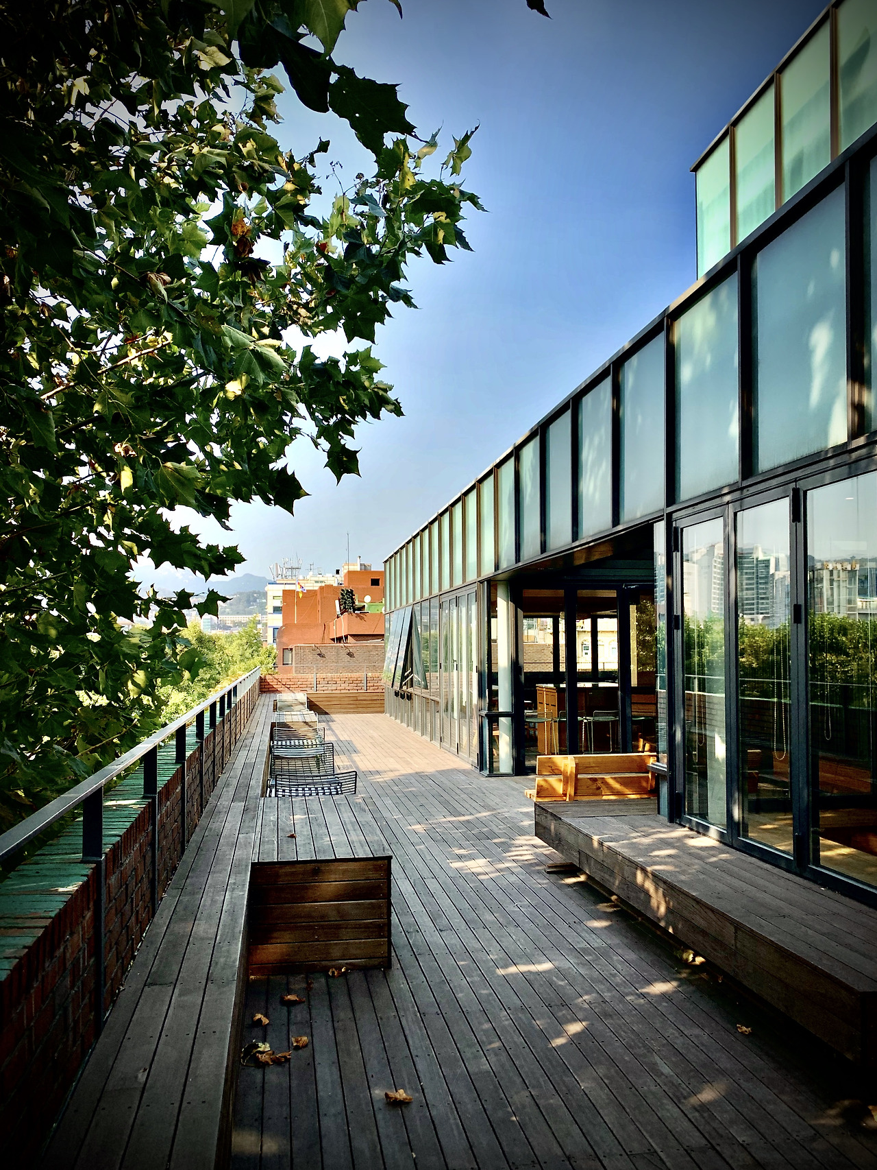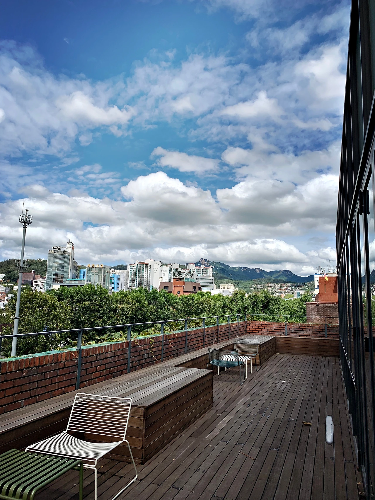 공공그라운드는 5층에 001 라운지와 테라스라는 공간이 있습니다. 대관을 해서 행사도 진행할 수 있고 평소에는 입주사들이 자유롭게 이용할 수 있는 공용공간인데 야외 데크가 압권입니다. 어떤 날은 구름 맛집으로 변신을 하고, 가끔은 노을 맛집이 되기도 합니다. 비오는 날은 빈대떡에 막걸리 생각이 나게합니다.
