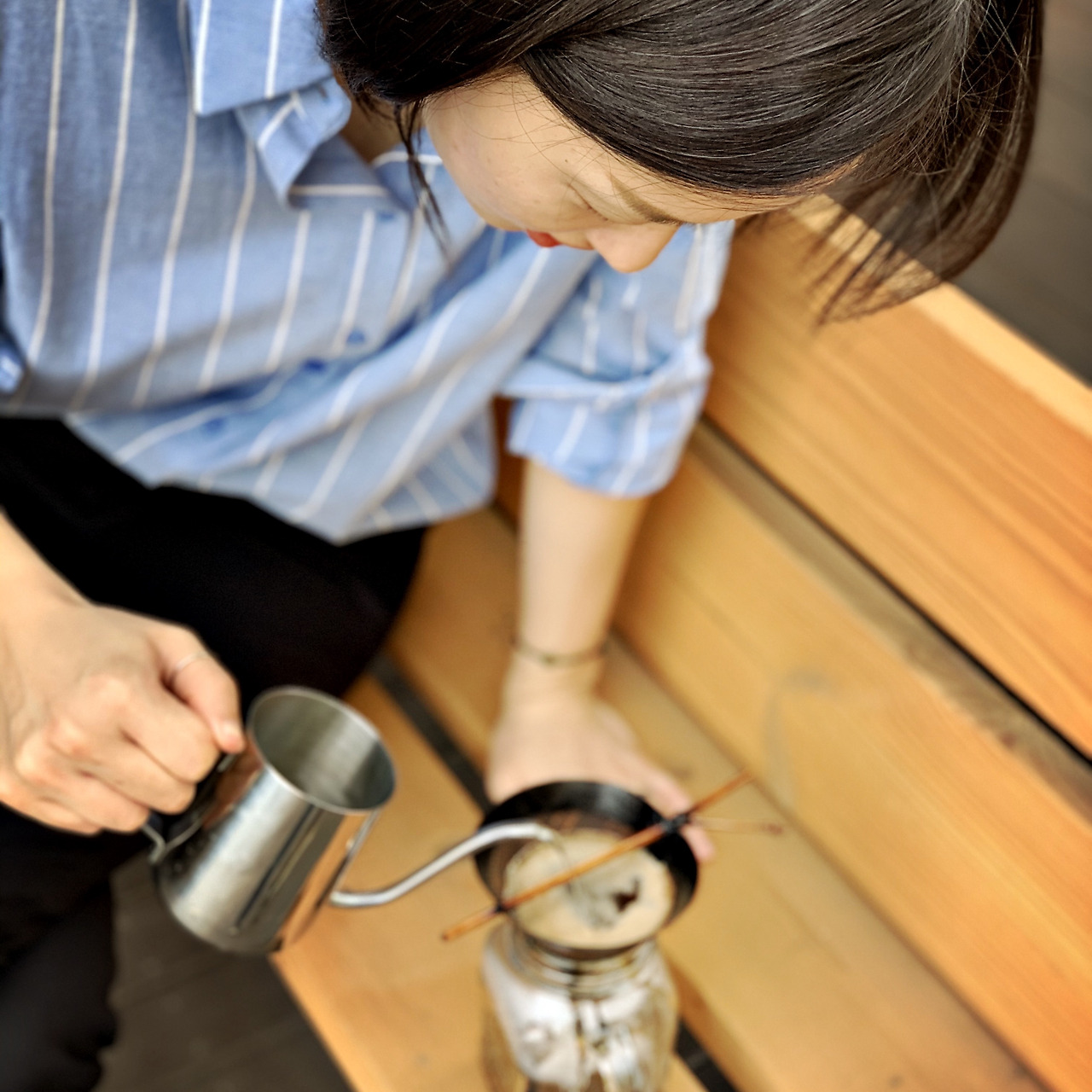 장사장님이 현란한 손놀림으로 마미체로 커피를 내리고 있습니다. 마미체의 촘촘함의 정도와 커피의 분쇄 정도를 가늠하면서 아주 기술적으로 커피를 내리시는 모습에 넋을 잃고 말았지 뭐예요.