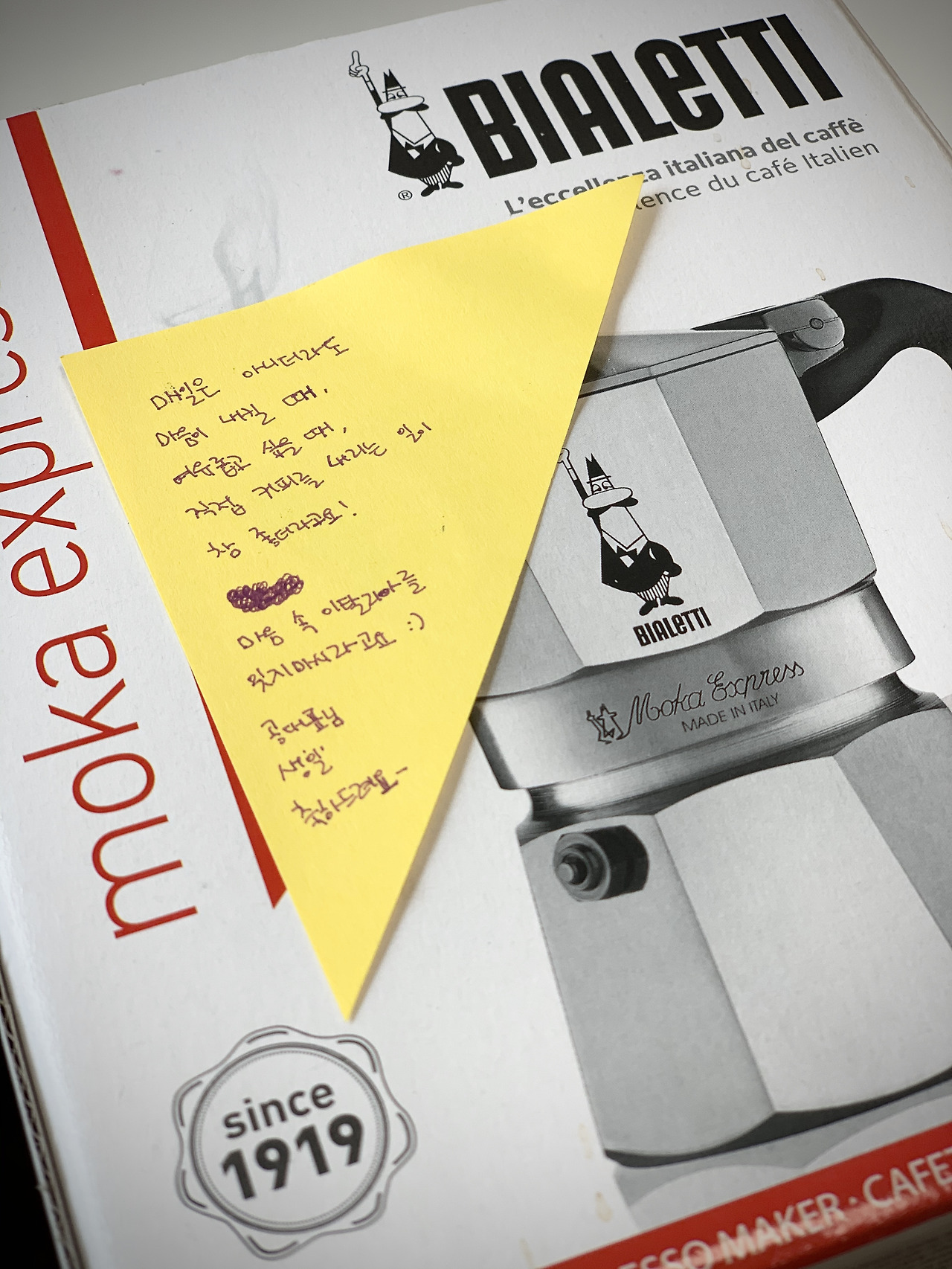 추석 연휴가 끝나고 일상으로 복귀해서 조금은 무료한 나날을 보내고 있던 날. 점심 먹으러 나갔다 왔더니 책상 위에 작은 상자 하나가 올려져 있었습니다. 제 생일이 추석 연휴 기간이었던 탓에 그냥 넘어간 게 미안했는지 옆 회사에 다니는(참고로 제가 일하는 곳은 '공공그라운드'라고 하는 코워킹 스페이스입니다) 오래 알고 지낸 후배가 놓고 간 선물이었는데요. 포장을 뜯어보니 비알레띠 모카포트(Moka Pot)였습니다.