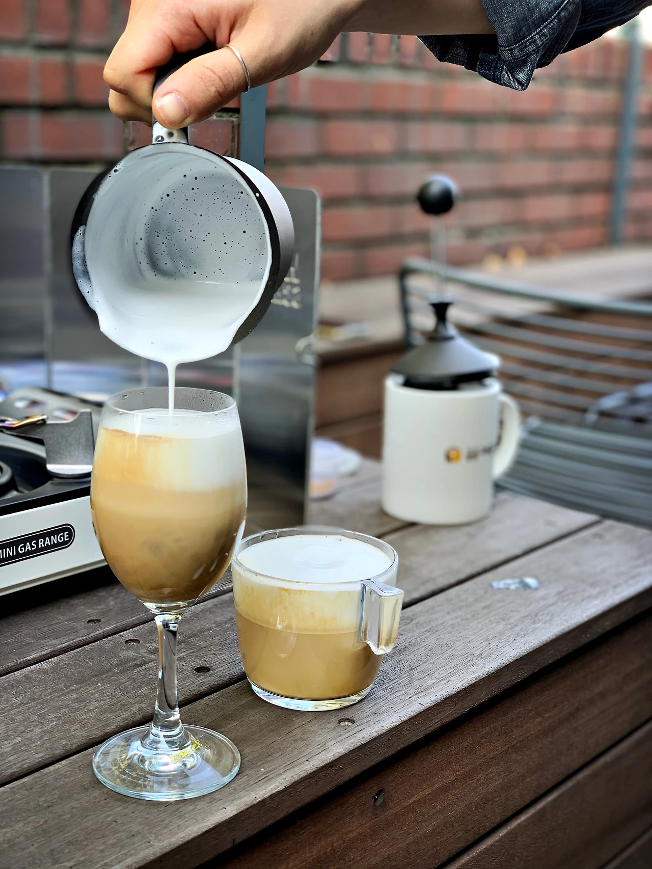 열심히 피스톤 운동을 반복하여 부드러운 거품을 냅니다. 게거품이 생기지 않도록 마지막에 3~4회 천천히 눌러주는 것이 포인트라고 장사장님이 말씀하셨습니다. 거품기 처음본 공사장은 마냥 신기합니다.