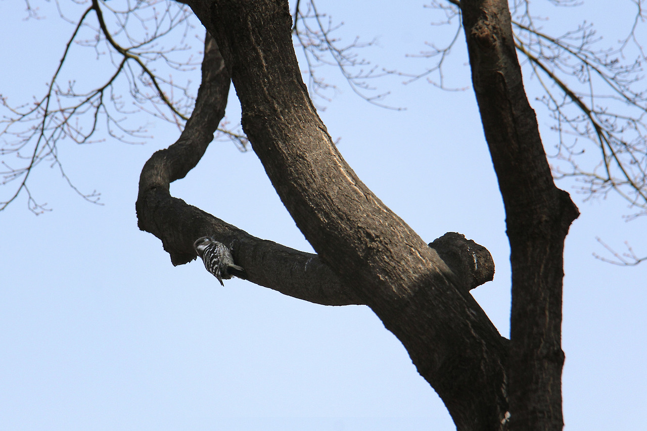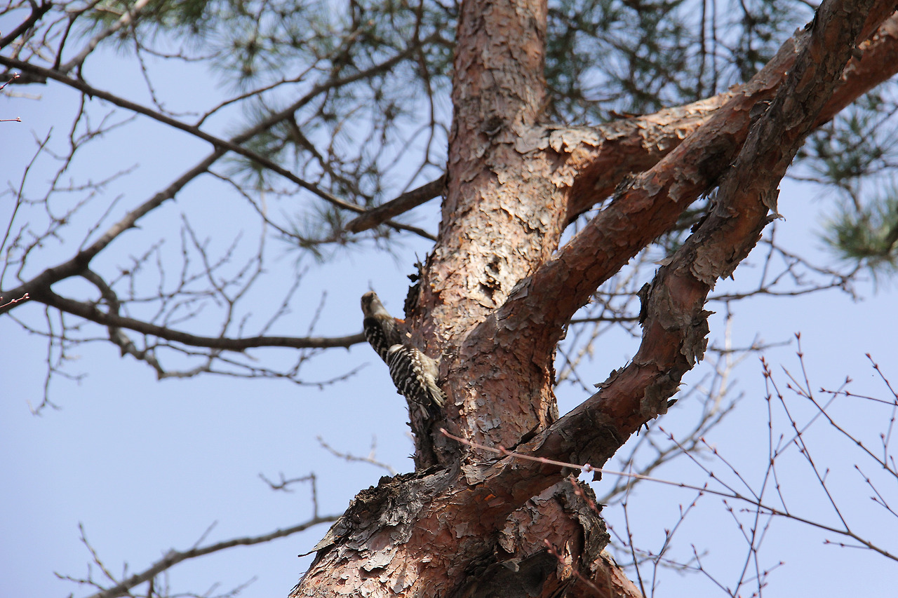 한참을 돌아다녀도 상모솔새는 모습을 보이지 않습니다. 아쉬운 마음을 한가득 가지고 산을 내려옵니다. 입구에 거의 다 왔을 때 뜻하지 않은 반가운 손님이 눈앞에 딱 나타나 줍니다. 챔기름을 바른 듯이 빠른 속도로 미끄러지듯이 뒷걸음치는 쇠딱따구리의 몸짓에 감탄을 합니다.