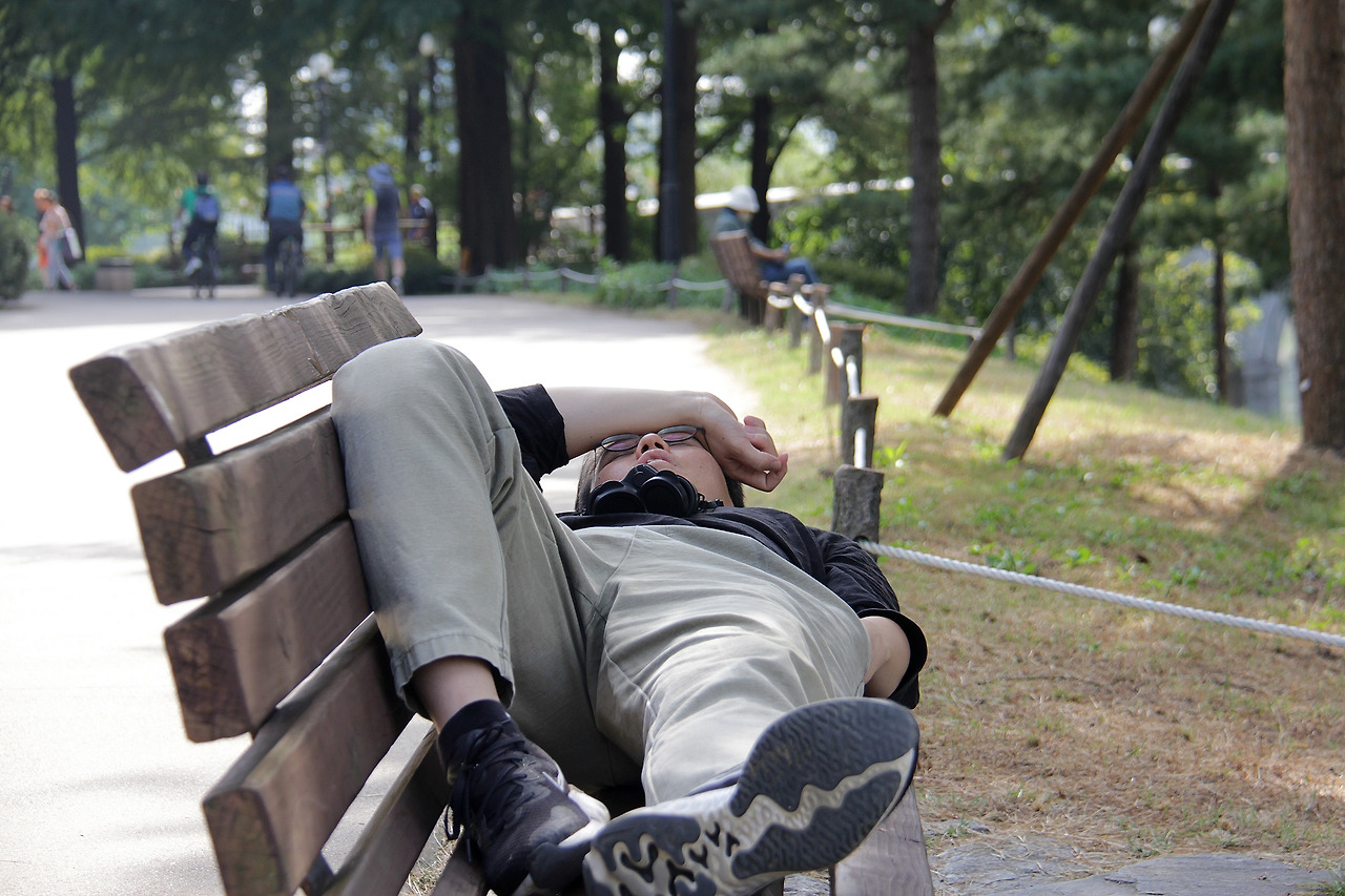 7시에 일어나서 아침 9시에 올림픽 공원에 도착해서 오후 3시까지 있었으니... 여섯 시간 동안 걸어 다니는 것은 반백을 바라보는 저에게는 조금 무리데쓰였나봅니다. 저기 보이는 벤치가 마치 침대로 보였습니다. 벤치에 누워 떡실신한 아빠의 모습을 작품으로 남겼다고 으스대는 탐조인. 10분간의 단잠을 깨우더니 아빠 저쪽으로 내려가 보죠? 합니다.