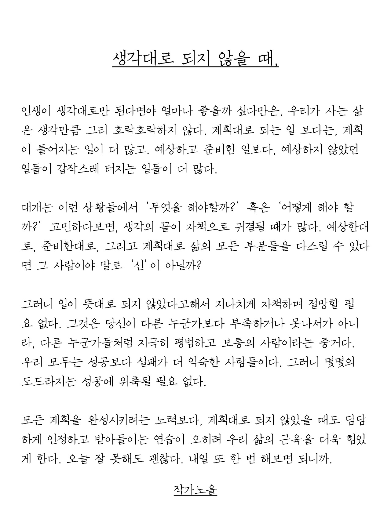 모든 계획을 완성시키려는 노력보다, 계획대로 되지 않았을 때도 담담하게 인정하고 받아들이는 연습이 오히려 우리 삶의 근육을 더욱 힘있게 한다. 오늘 잘 못해도 괜찮다. 내일 또 한 번 해보면 되니까.