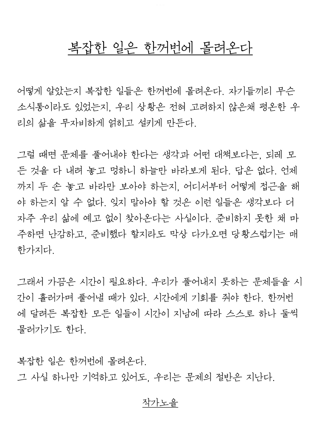어떻게 알았는지 복잡한 일들은 한꺼번에 몰려온다. 자기들끼리 무슨 소식통이라도 있었는지, 우리 상황은 전혀 고려하지 않은채 평온한 우리의 삶을 무자비하게 얽히고 설키게 만든다.