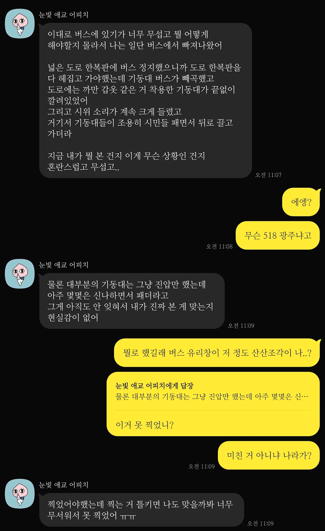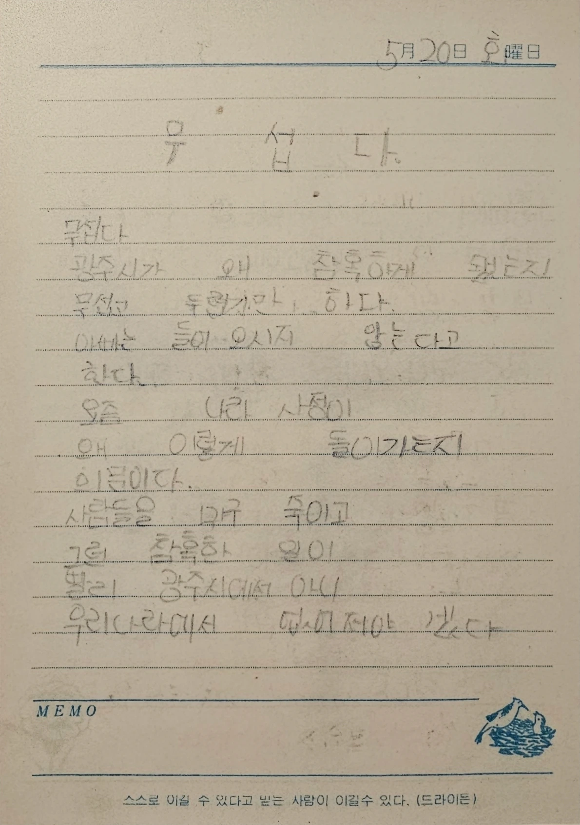 당시를 겪은 초등학생부터 성인까지 시민들의 일기들을 읽자마자 눈앞이 뿌예졌다. 슬프기도 하고, 화도 났다. 아직도 518 민주화 운동을 폭동으로 프레이밍 하는 쓰레기들이 이 땅을 버젓이 걸어 다니고 있다.