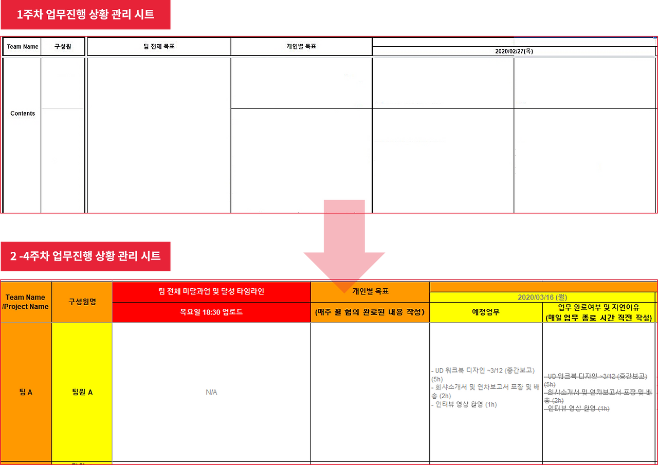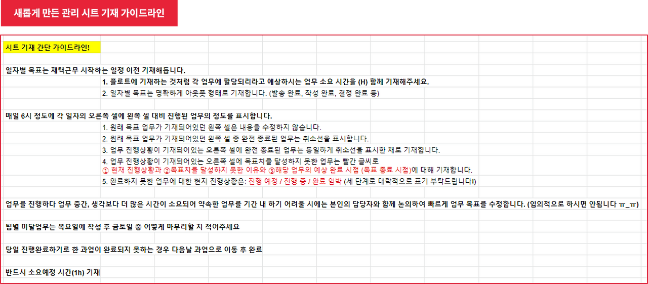 1주 차에는 원격근무 가이드만 있어 업무 진행상황 관리 시트에 팀마다, 크루마다 업무 계획을 작성하는 방식이 조금씩 달랐습니다. 소요시간(H) 단위까지는 적지 않는 경우, 일자별 목표가 있지만 아웃풋 형태가 아닌 경우, 당일 미완료 업무에 대한 다음 액션 플랜을 적지 않는 경우 등 케이스가 다양했죠. 2주 차부터는 업무 진행상황 관리 시트 작성 규칙을 설정하여 모든 크루가 정해진 시간 내에, 같은 방식으로 작성하도록 했고, 기존 납기를 지키지 못할 경우 사전에 PM과 협의를 거친 후에만 시트를 수정하도록 했습니다.
