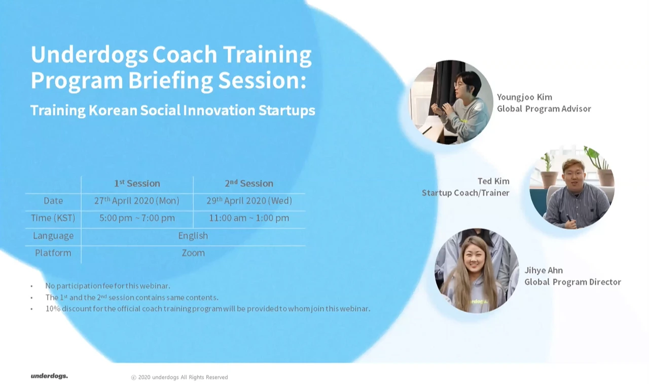 언더독스는 2020년 4월 27일과 29일, 이틀 간 코치 트레이닝 프로그램에 대한 관심과 니즈를 파악하기 위하여 코치 트레이닝 브리핑 세션이라는 이름으로 한국의 사회혁신 스타트업을 소개하는 웨비나를 진행했습니다.