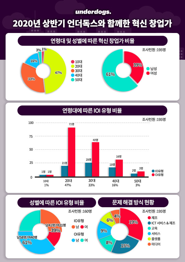 본 2020년 상반기 언더독스 진행 창업 프로그램과 창업가 조사는 수많은 창업가들 중 언더독스 창업교육 프로그램과 함께한 창업가들만을 대상으로 진행했기에, 창업 생태계 전반을 대표하거나 일부 결과를 바탕으로 일반화될 수 없습니다.