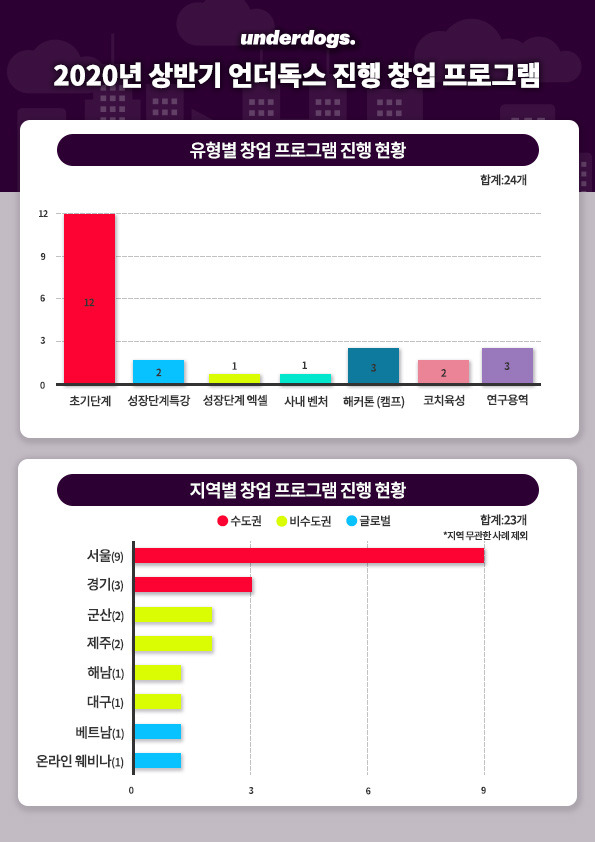 2020년 상반기 동안 언더독스는 24개의 혁신 창업 프로그램을 운영하고 기획했습니다. 절반 정도는 언더독스의 혁신 창업 방법론을 토대로 초기와 예비 혁신 창업가를 육성하는 프로그램이었고요, 그 외 성장 단계에 있는 창업가들을 위한 특강, 액셀러레이팅 프로그램을 진행했습니다.
