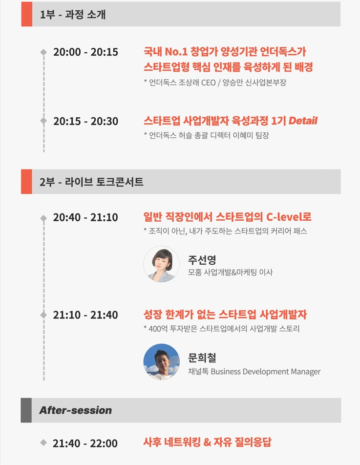 좋은 창업팀이 세상을 바꾼다고 믿는 언더독스가 왜 인재를 육성하는 사업까지 시작하게 되었는지 언더독스 조상래 대표님이 직접 이야기 해주셨습니다. 또한 지금까지 8년 동안 창업가를 육성해 온 노하우과 전문성성을 통해 얼마나 진심을 담아 '스타트업 핵심인재'를 육성하고자 하는지 전달해 주셨습니다.