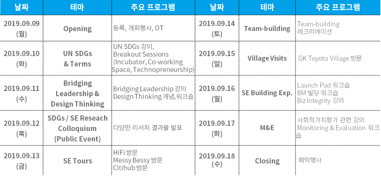 UN SDGs (Sustainable Development Goals)의 지역화를 목표로 '지속가능한, 포용적인 개발을 위한 고등 교육 기관들의 참여'를 테마로 하는 10일 간의 행사. 게다가 11개 국가, 22개 교육 기관에서 온 100명 이상의 참여자가 함께 하는 인터내셔널 부트캠프라라니!