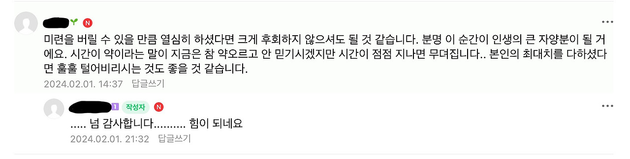 사실 다른 댓글처럼 형식적으로 “힘내세요”혹은 “잘 될 겁니다”라고만 작성했어도 요건은 채우는 거였지만 나름대로 경험과 진심을 꾹꾹 눌러담아 작성했었다. 내 마음이 전달되었는지 게시글 작성자께서 내 댓글에만 감사하다고, 힘이 되었다고 답글을 달아주셨다.