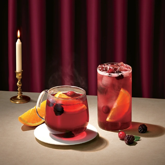 크리스마스 리스를 닮은 로즈마리와 레드커런트로 장식한 ‘핑크 캐모마일 릴렉서’. 리치, 레몬그라스, 캐모마일의 새콤달콤한 조합에 유스베리 티를 더해 화사한 향미가 돋보이는 음료입니다. 톡 쏘는 샴페인과도 같아서 크리스마스 파티의 즐거운 분위기를 느낄 수 있답니다.