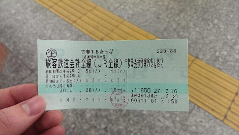 '청춘 18'이라는 티켓의 장점은 그 이름과는 다르게 나이 제한이 없다는 것과 약 만 엔 정도에 5일간 전철을 무제한으로 탈 수 있다는 것이다. 하지만 특정 기간에만 발권되는 저렴한 가격의 이벤트성 티켓이다 보니 거의 모든 역에 정차를 해야 한다는 게 단점일 수 있다. 그러한 단점들은 천천히 흘려보내는 일본의 차창 밖 풍경을 쳐다보는 것을 좋아하는 나에게는 딱 제격이었다.