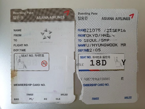 일본으로 유학을 떠나던 비행기 티켓 (왼쪽)과 유학을 마치고 한국으로 돌아오던 비행기 티켓 (오른쪽)