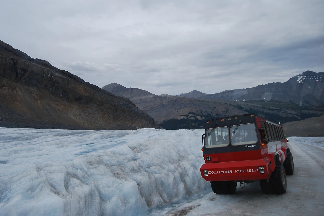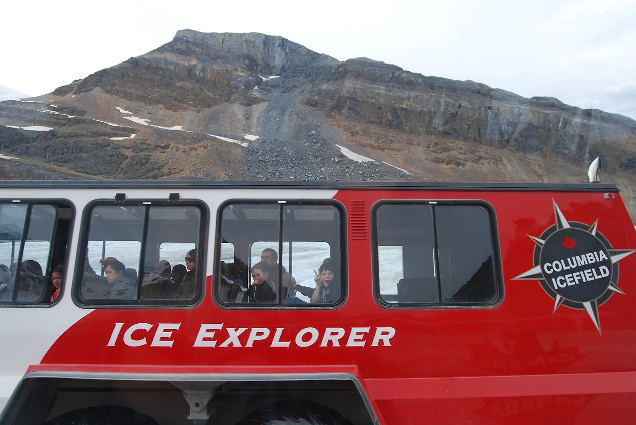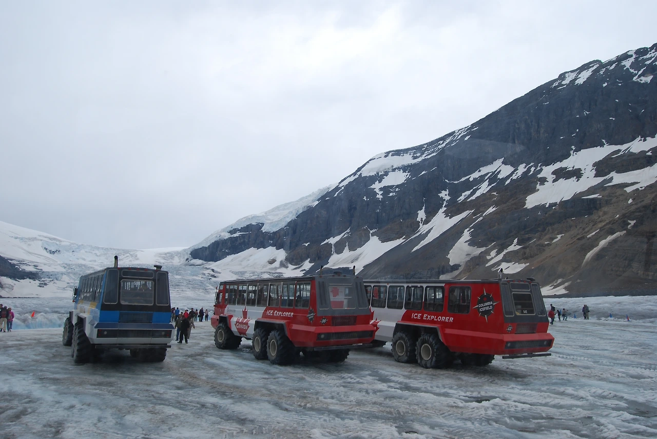 컬럼비아 대빙원은 그 넓이가 325km², 가장 두꺼운 지점의 두께가 365m라고 한다. 100층 가까이 되는 빌딩과 비슷한 두께라니 얼마나 두껍게 쌓여 있는지 짐작할 수 있다. 전 세계 빙원 중 유일하게 설상차가 오갈 수 있어서 로키 관광의 필수 코스다. 사람 키만 한 대형 바퀴가 달린 거대한 설상차를 타고 컬럼비아 대빙원의 일부인 애서배스카 빙하를 오를 수 있다. 우리가 타고 온 버스는 주차장에 안전하게 세워두고, 특수 제작한 Ice Explorer를 타고 올라간다. 대빙원 위의 설상차가 조그마한 장난감 자동차처럼 보인다.