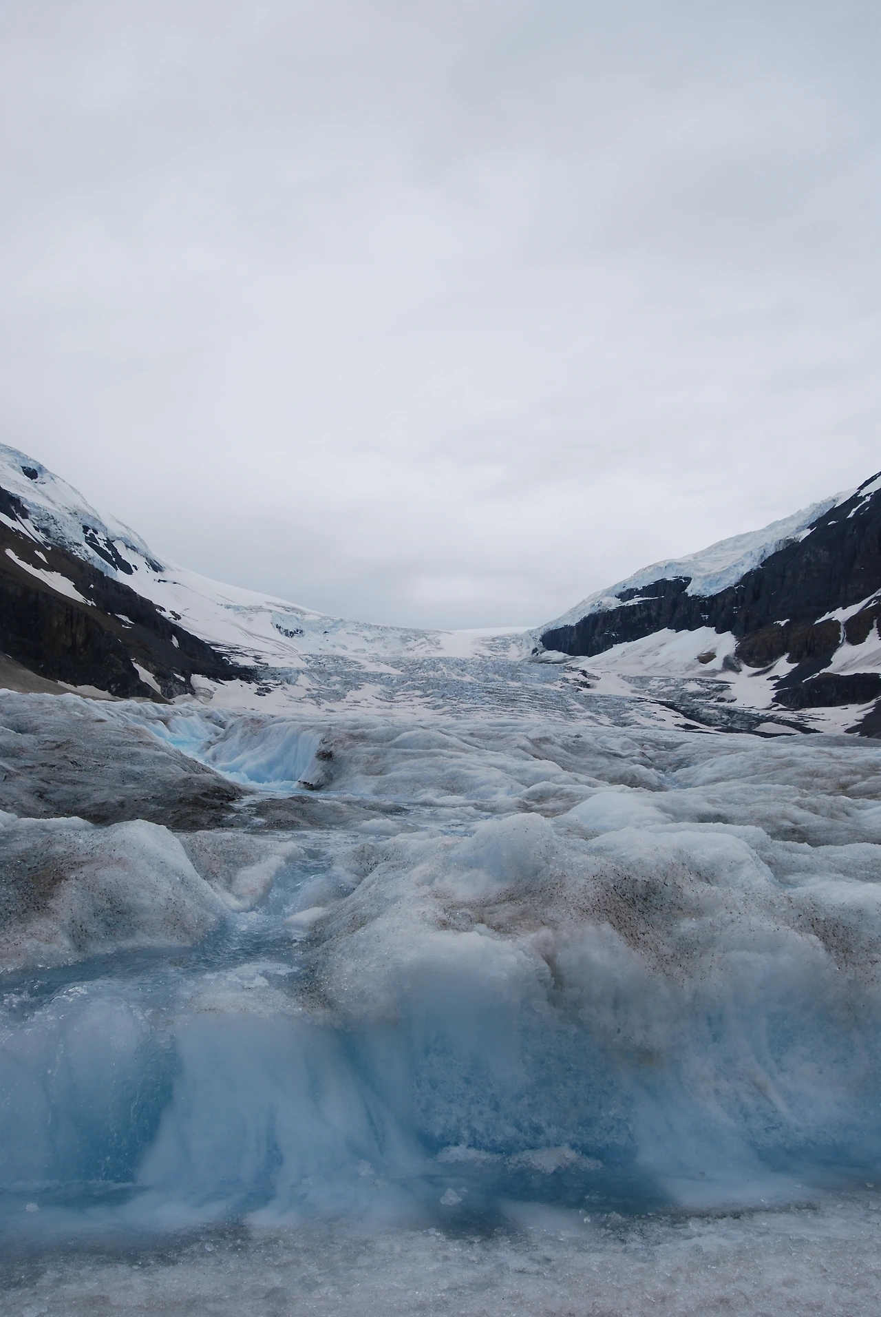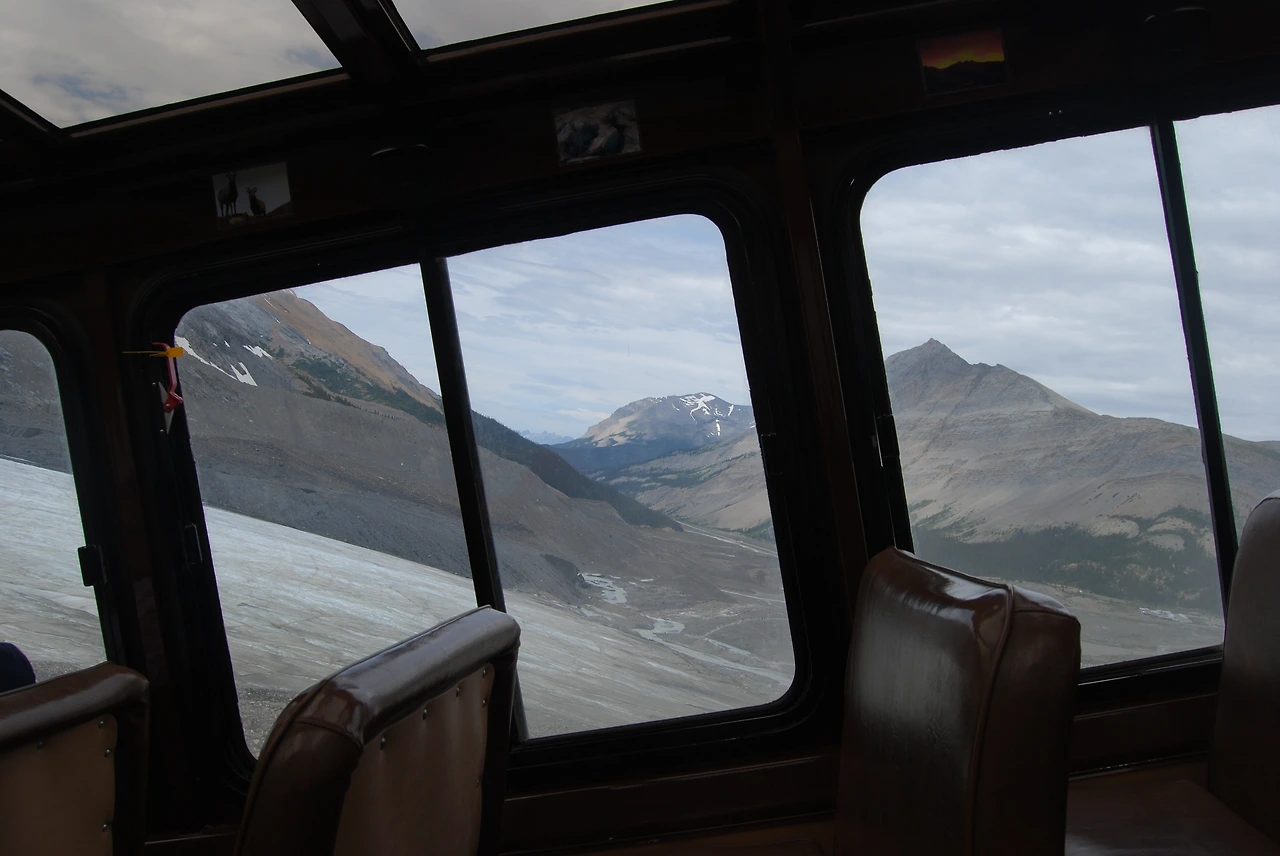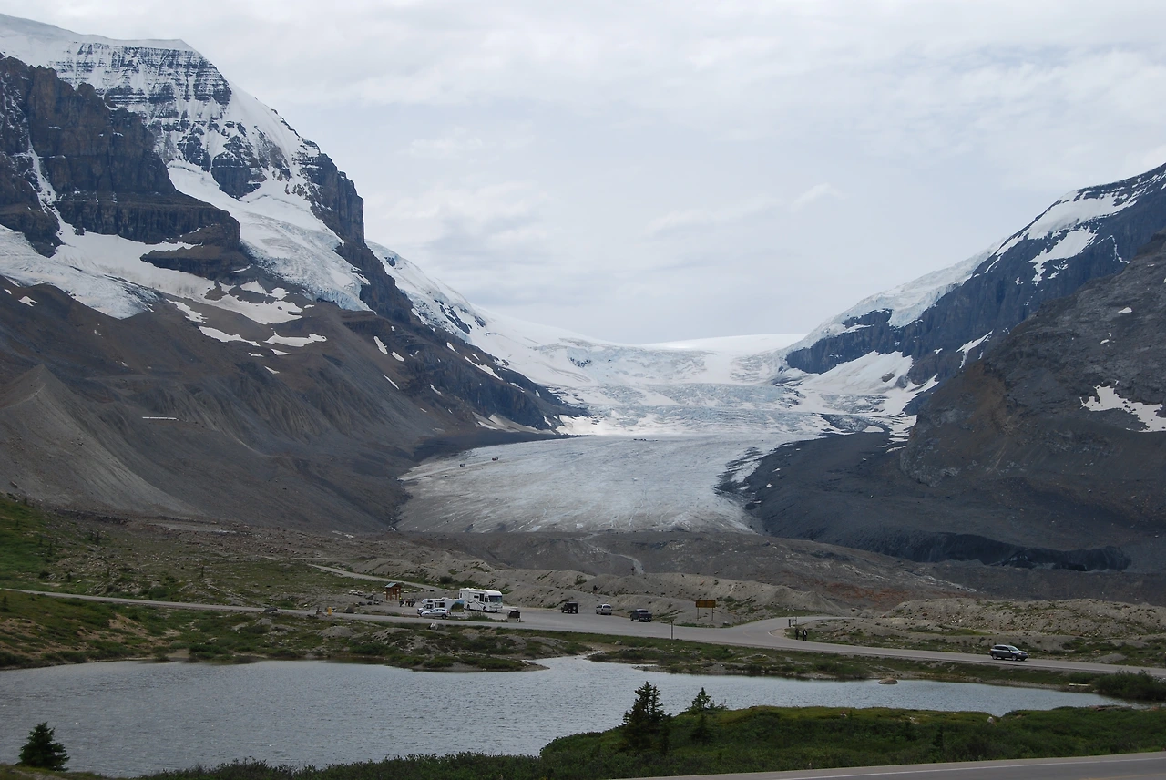컬럼비아 대빙원은 그 넓이가 325km², 가장 두꺼운 지점의 두께가 365m라고 한다. 100층 가까이 되는 빌딩과 비슷한 두께라니 얼마나 두껍게 쌓여 있는지 짐작할 수 있다. 전 세계 빙원 중 유일하게 설상차가 오갈 수 있어서 로키 관광의 필수 코스다. 사람 키만 한 대형 바퀴가 달린 거대한 설상차를 타고 컬럼비아 대빙원의 일부인 애서배스카 빙하를 오를 수 있다. 우리가 타고 온 버스는 주차장에 안전하게 세워두고, 특수 제작한 Ice Explorer를 타고 올라간다. 대빙원 위의 설상차가 조그마한 장난감 자동차처럼 보인다.