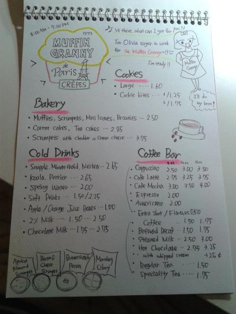 - 머핀 그래니의 메뉴 보드가 참 예쁘더라. 어차피 일하려면 메뉴를 잘 알아야 하는데 미리 공부할 겸 재미 삼아 그려봤어. 그만큼 여기서 일하고 싶어! 머핀 그래니에서 날 뽑아준다면, 좋은 선택이 될 거야. 난 누구보다 최선을 다할 거니까!