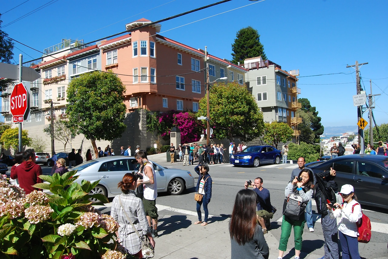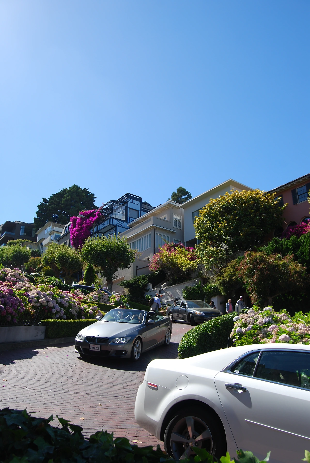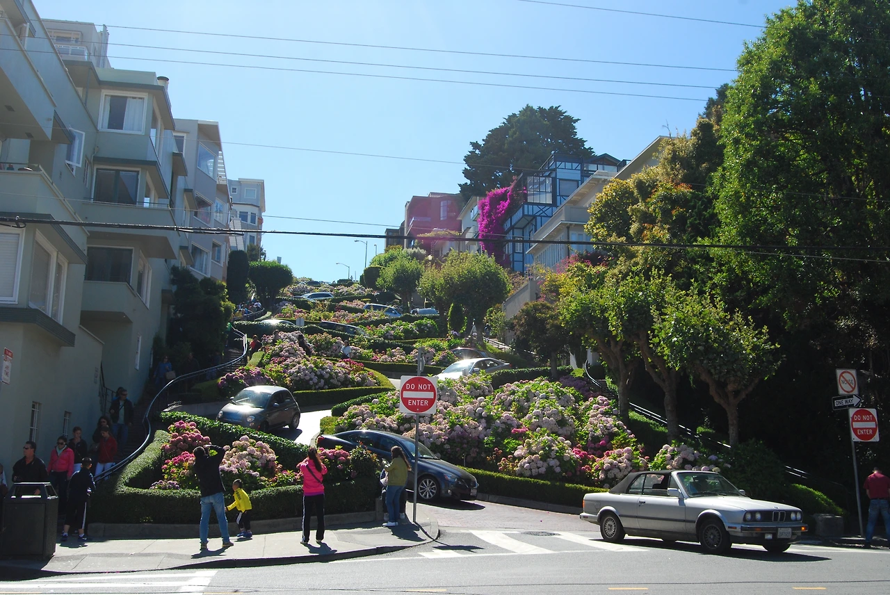 걷다 보니 금방 도착했다. 러시안 힐에 있는 롬바드 스트리트. 그 꼭대기에 서면, 갑자기 무슨 이런 길이 다 있을까 싶다. 세상에서 가장 구불구불한 도로(The crookedest street in the world)로 불리는 180m(600피트)밖에 안 되는 짧은 길이다. S 형태의 급커브 8개가 이어진 일방통행 길. 도시 전체적으로 경사진 언덕길이 많은데 그중에서도 가장 가파르다. 그렇다 보니 위험할 수 있는데, 구불구불하게 길을 만들어서 속력을 내지 않게끔 1922년에 주민들에 의해 만들어졌다고 한다. 언뜻 보면, 길이라기 보단 작은 정원처럼 보인다. 잘 가꿔진 꽃과 나무길. 그 사이를 아슬아슬하게 지나는 차. 구경하는 사람들로 붐빈다.