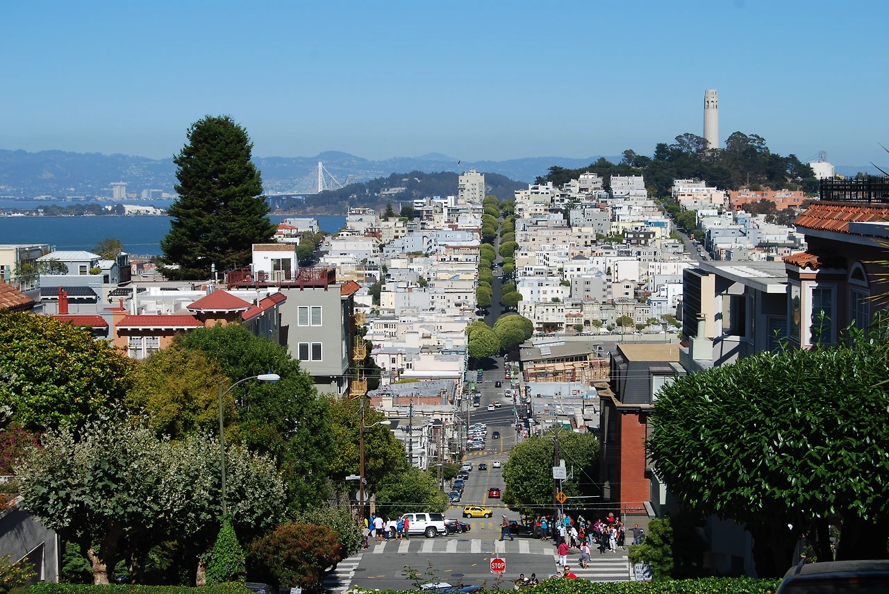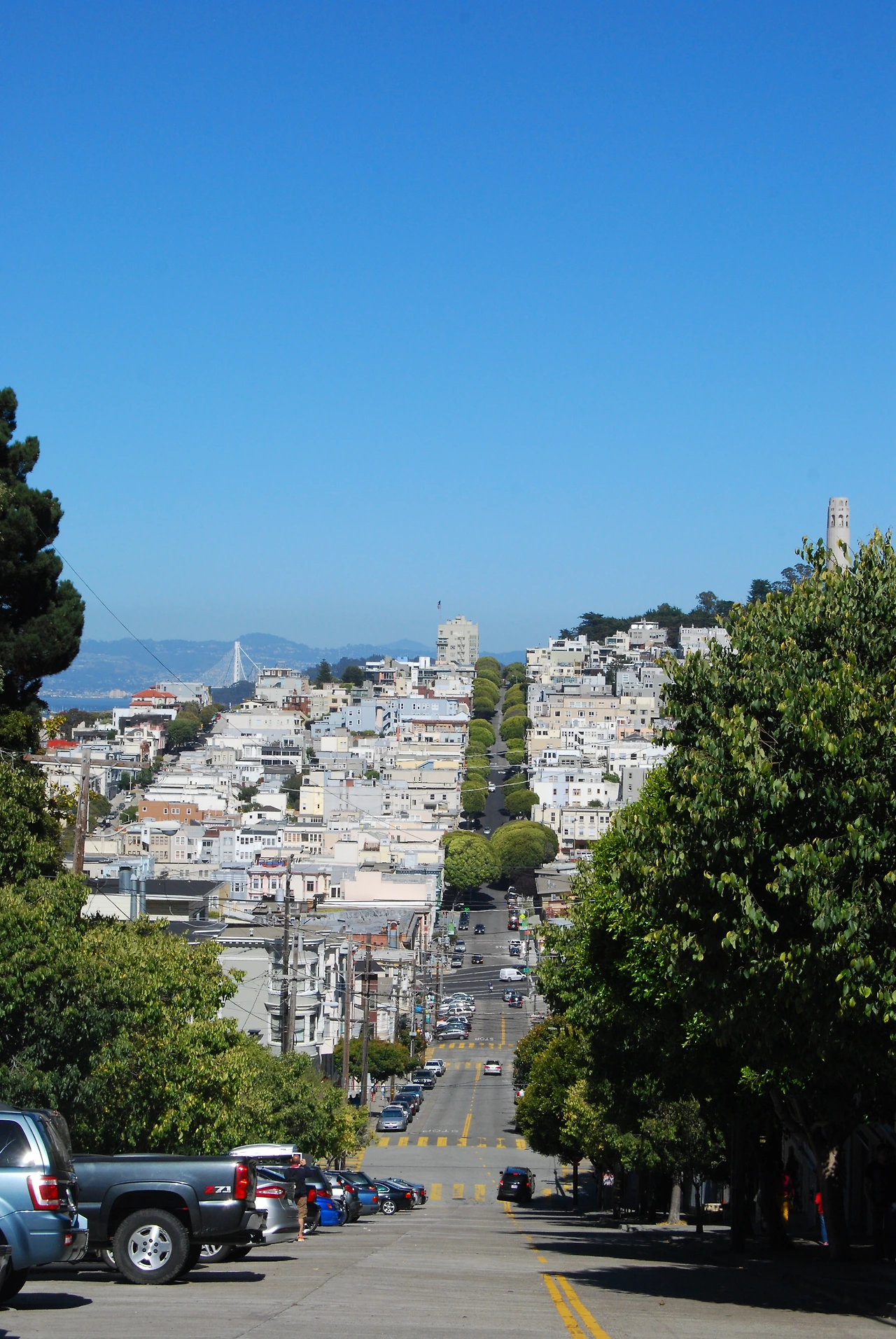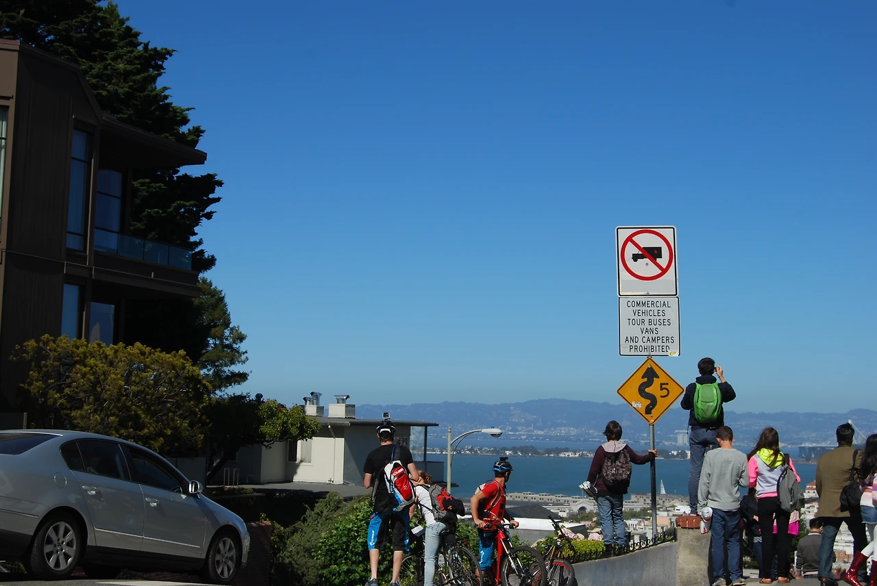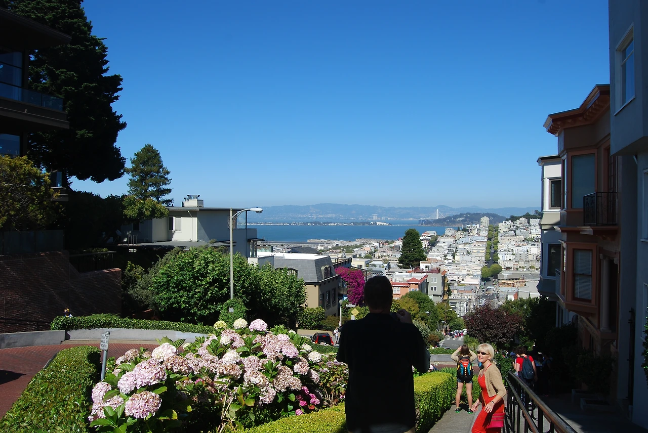 길 양쪽으로는 사람들을 위한 인도가 잘 나 있어서 걸어내려 가며 사진을 남긴다. 바다를 배경으로 한눈에 들어오는, 샌프란시스코의 내리막 풍경이 낭만적이다.