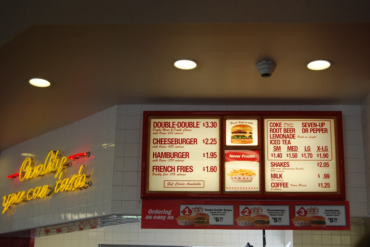 뜨거운 태양 아래, 드라이브 스루 행렬도 길었는데 매장 내부는 더 북적거렸다. 그도 그럴 것이, 가성비가 좋은 버거다. 패티와 치즈가 두장씩 들어간 더블더블 버거가 4달러도 채 되지 않는다.