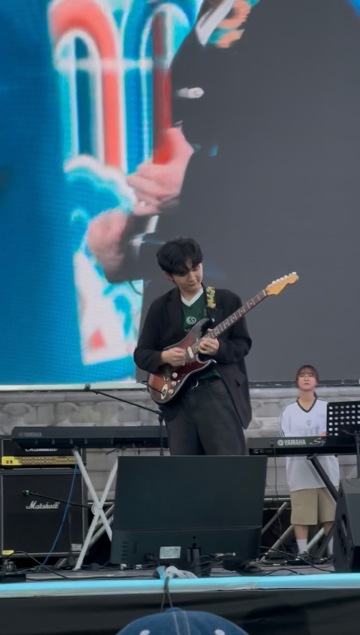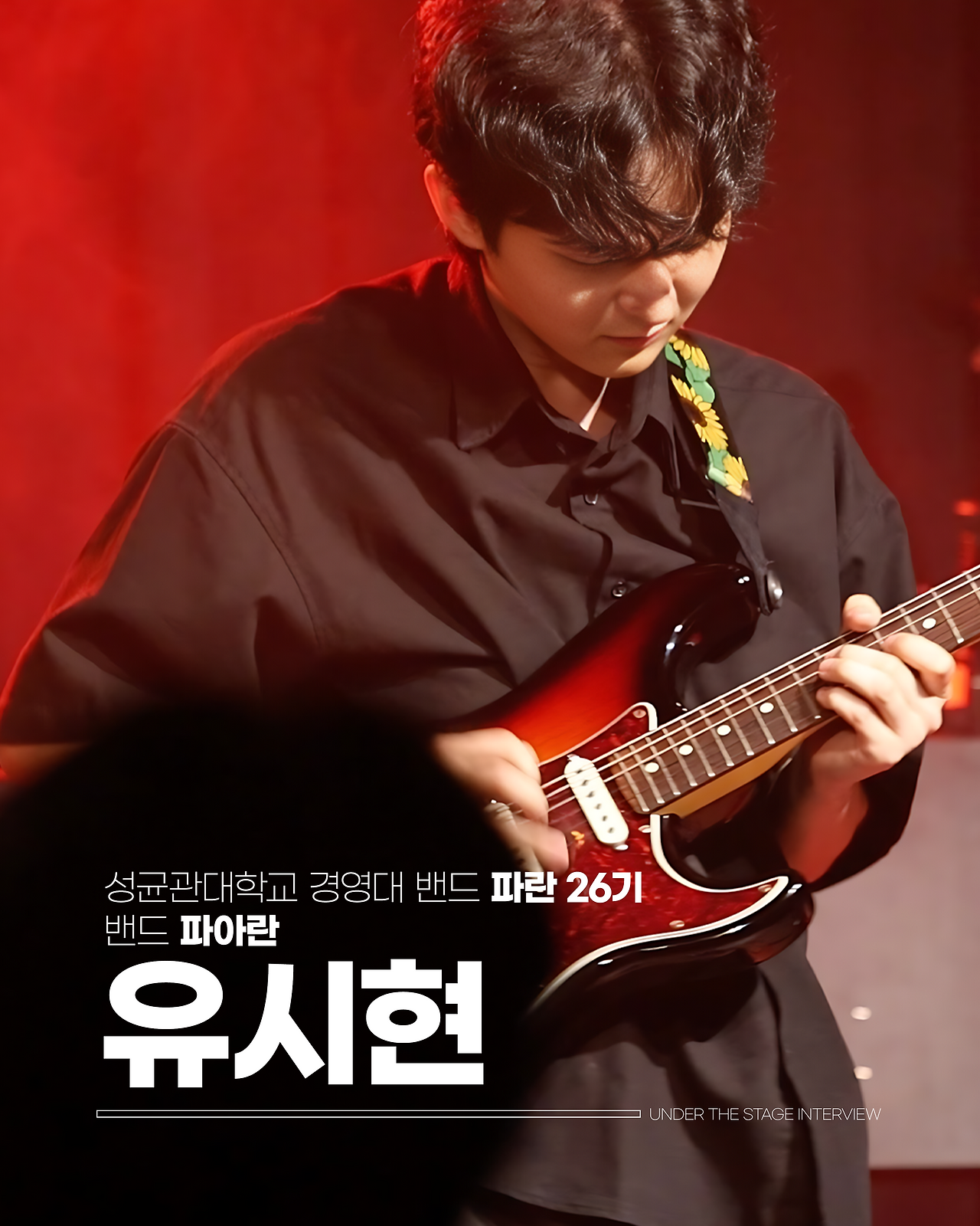 안녕하세요. 성균관대학교 23학번 화학과 유시현입니다. 거쳐 간 밴드가 많기는 하지만 지금은 경영대 밴드 파란과 파아란이라는 팀 밴드에서 기타 치고 있습니다.