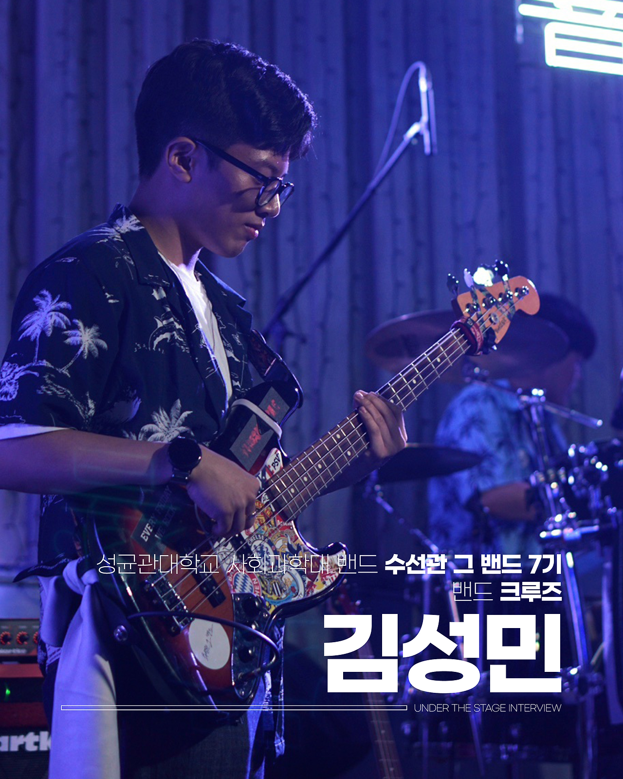 그러다가 밴드에 대한 로망을 처음 실현하게 된 것은 아무래도 2정공(2학기 정기 공연), 저의 첫 공연이자 위 기수의 마지막 공연이었습니다. 물론 그때도 관객은 코로나 때문에 받지는 못했어요. 그래서 오피들(수그밴 졸업 기수들)만 구경 오시고, 우리끼리의 발표회 같은 느낌으로 공연을 했는데 그마저도 너무 좋았던 것 같아요. 그리고 베이스라는 악기가 묵묵하고 조용한 악기라 막 주목받거나 칭찬받는 악기가 아닌데, 마침 2정공 때 베이스가 좀 튀는 노래가 있었어요. 쏜애플의 ‘우리의 밤은 당신의 낮보다 아름답다’라는, 베이스 인트로가 있는 곡이었는데, 제가 베이스로 인트로를 들어가면 사람들이 ‘우와 성민이 잘한다’이러니까 그게 기분이 너무 좋았던. 내가 뭔가 한다는 걸 알아주고, 그 당시에 있었던 마음의 문제를 밴드 활동을 하면서 응원받고 치유받는 느낌이라 ‘밴드 하길 잘했다’, ‘이게 밴드구나’ 했던 것 같습니다.