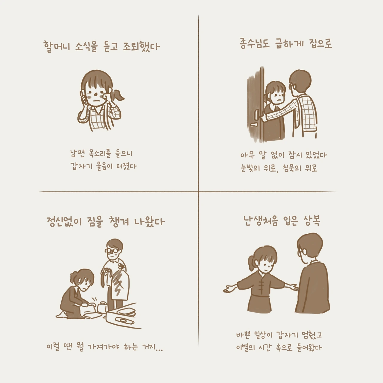 급하게 지방에 내려와 손님을 치르며 슬퍼할 겨를도 없이 하루를 보냈지만, 남은 시간 할머니를 곰곰이 기억하고 잘 보내드리려 합니다.
