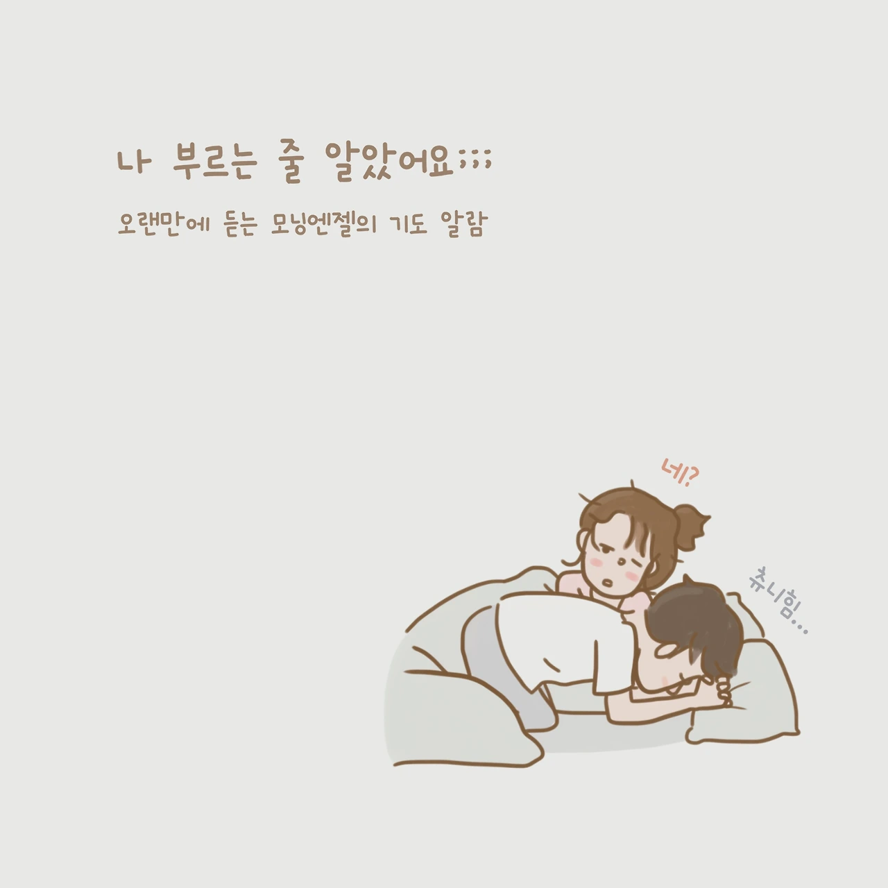 ‘츄니임...’ 잠결에 들리는 소리에 나를 부르는 줄 알고 ‘네???’하던 신혼 초. 그땐 낯선 곳에서 낯선 사람(?)과 자는 긴장에 작은 소리에도 벌떡벌떡 깨곤 했다. 내 이름을 부르는 줄 알았던 그 소리는 알고 보니 ‘주님….’ 하는 남편의 기도 소리. 그리고 오늘 오랜만에 또 깼네? 덕분에 새벽에 일어나 무릎 꿇고 기도하고 있는 남편을 오랜만에 봤다. 기도 안 해도 대충 행복하게 잘 사는 거 아닌가 하는 생각이 들기도 했던 요즘, 남편의 기도 덕에 늘 무사히 살고 있었던 건 아닌지. 나를 받아주는 넓은 마음과 고통받는 사람에 대한 관심, 다른 사람과 비교하지 않고 절제하는 삶 모두 기도의 힘이었겠구나 싶다. 요 며칠 사소한 일에도 버럭하고 작은 바람에도 휘청였던 감정들, 나로 가득찬 이기적인 뇌구조가 떠올라 부끄러워지네... 남편에게 진 기도의 빚을 갚기 위해 오늘 나도 누군가를 위해 무릎을 꿇기로 결심한다!