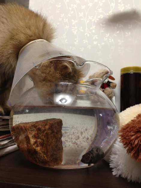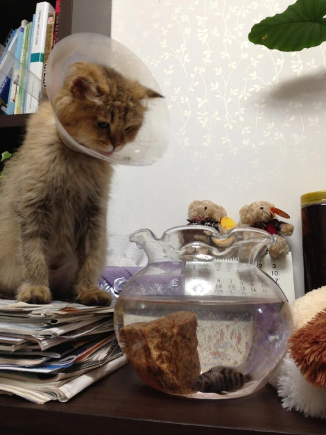 나뷔는 새 집부터 구석구석을 살핀다. 새 집사에는 아직 관심 없다. 집안 스캔을 마친 다음, 나의 물지기 동물들에게 다가간다. 입맛을 다신다.