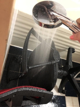의자를 욕실로 굴려 들여놓고서는 스펀지가 있는 시트에 뜨건 물을 한참 부어대고 세제를 뿌려 이삼일을 불리고 표백 살균세제로 또 이삼일을 흠씬 적신 채 두었다. 샤워 호수로 충분히 물 뿌리는 것 말고는 헹굴 방법도 없다. 양지바른 베란다에 또 이삼일을 눕혀 겨우 말렸다.