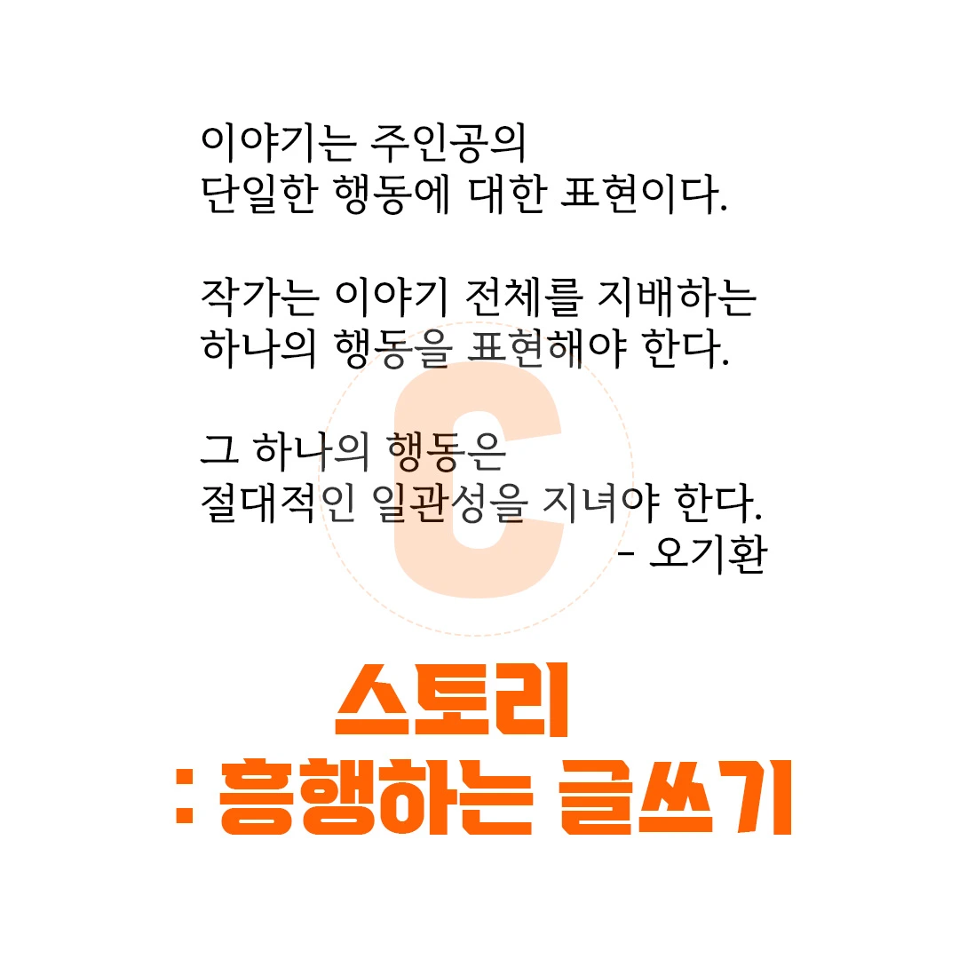 이야기는 주인공의 단일한 행동에 대한 표현이다. 작가는 이야기 전체를 지배하는 하나의 행동을 표현해야 한다. 그 하나의 행동은 절대적인 일관성을 지녀야 한다. - 91쪽