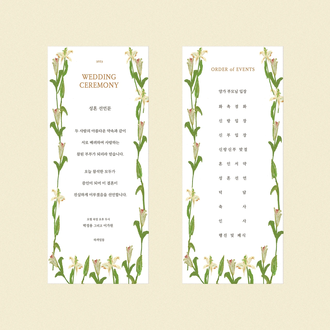 오일 파스텔로 한 송이씩 그린 카라 릴리 꽃을 테두리에 두르고, 주황색과 진갈색 폰트로 매치해 보기 좋게 작업했습니다:)
