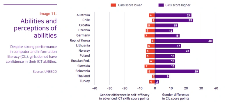 이러한 성차별적 편견의 영향은 우리 머릿속에서 현실도 덮어버릴 만큼 엄청나다. 국제적으로 개인의 컴퓨터 및 정보 리터러시 역량은 ICILS라는 시험을 통해 수치화될 수 있는데, 최근 21개국에서 진행된 ICILS 시험 결과에 따르면 여아의 ICT 역량은 남아와 같거나 남아보다 월등히 우수한 것으로 나타났다. 그러나 여아들의 고급 ICT 기술에 대한 자기효능감(self-efficacy, 즉, 실제가 아닌 자기가 인지하고 있는 자신의 능력)은 모든 국가에서 남아에 비해 떨어졌다. 다시 말하면, 실제로는 여성이 남성에 뒤처지지 않는 역량을 가지고 있음에도 불구하고 사회적 편견과 각종 제약 때문에 여아들은 자신이 뒤쳐졌다고 생각하는 것이다. 이는 여아의 일생동안 꾸준히 유지되어 그들이 ICT 관련 전공을 선택하지 않거나 관련 업계에 진출하지 않는 것을 선택하게 되는 원인이 된다. 그 결과 ICT 관련 전공 전반에서는 그 어느 분야에서도 찾아볼 수 없이 심각한 성별 불균형이 일어나게 되었다.