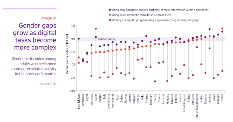 그런데 문제는 전 세계적으로 이러한 디지털 역량을 보유하고 향유하는 능력에서 남성과 여성 간 격차가 꾸준히 존재했다는 점이다. 엑셀에서 단순한 계산을 하는 정도의 디지털 스킬만 놓고 봐도 여성이 남성보다 이 작업을 해낼 가능성은 25% 정도 낮게 평가됐으며, 기술의 난이도가 올라갈수록(코딩 등) 성별 간 능력의 격차는 더욱 커짐을 확인할 수 있었다. 그리고 그 격차는 나날이 증가하고 있다. 국제전기통신연합(ITU)에 따르면, 2013-2017년 사이 남녀 간 인터넷 보급률 격차는 11%에서 11.6%로 증가했고, EU와 미국에서 모두 ICT 관련 전공자 중 여성의 비율은 꾸준히 하락해 왔다.