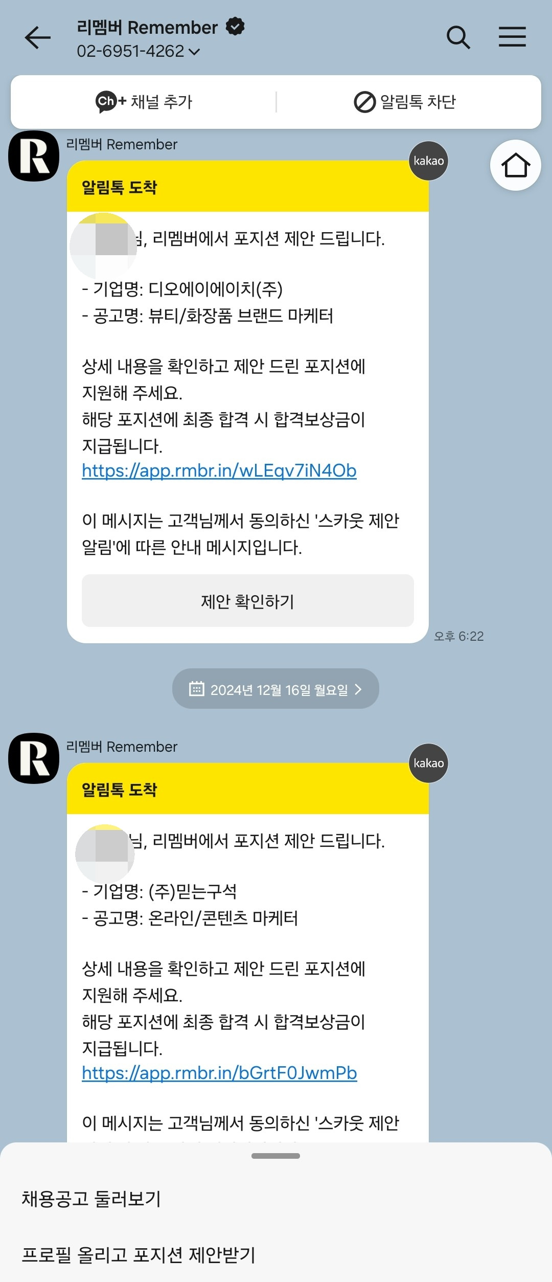 특히, "포지션 제안"라는 단어를 사용한 메시지는