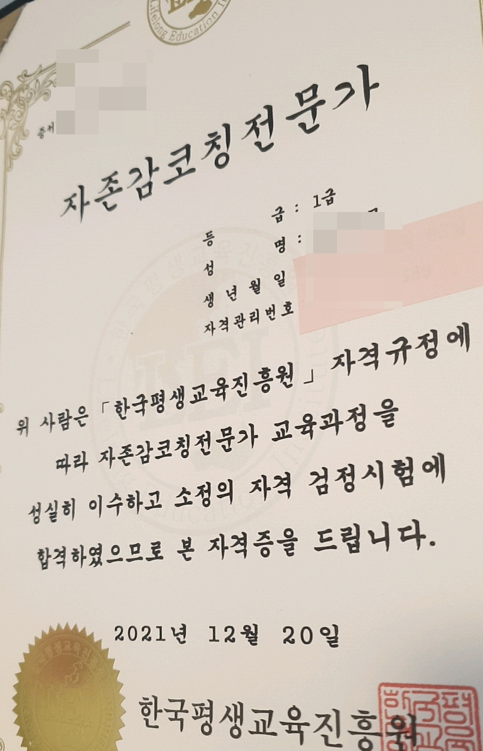 자존감 코칭 전문가 1급 자격증