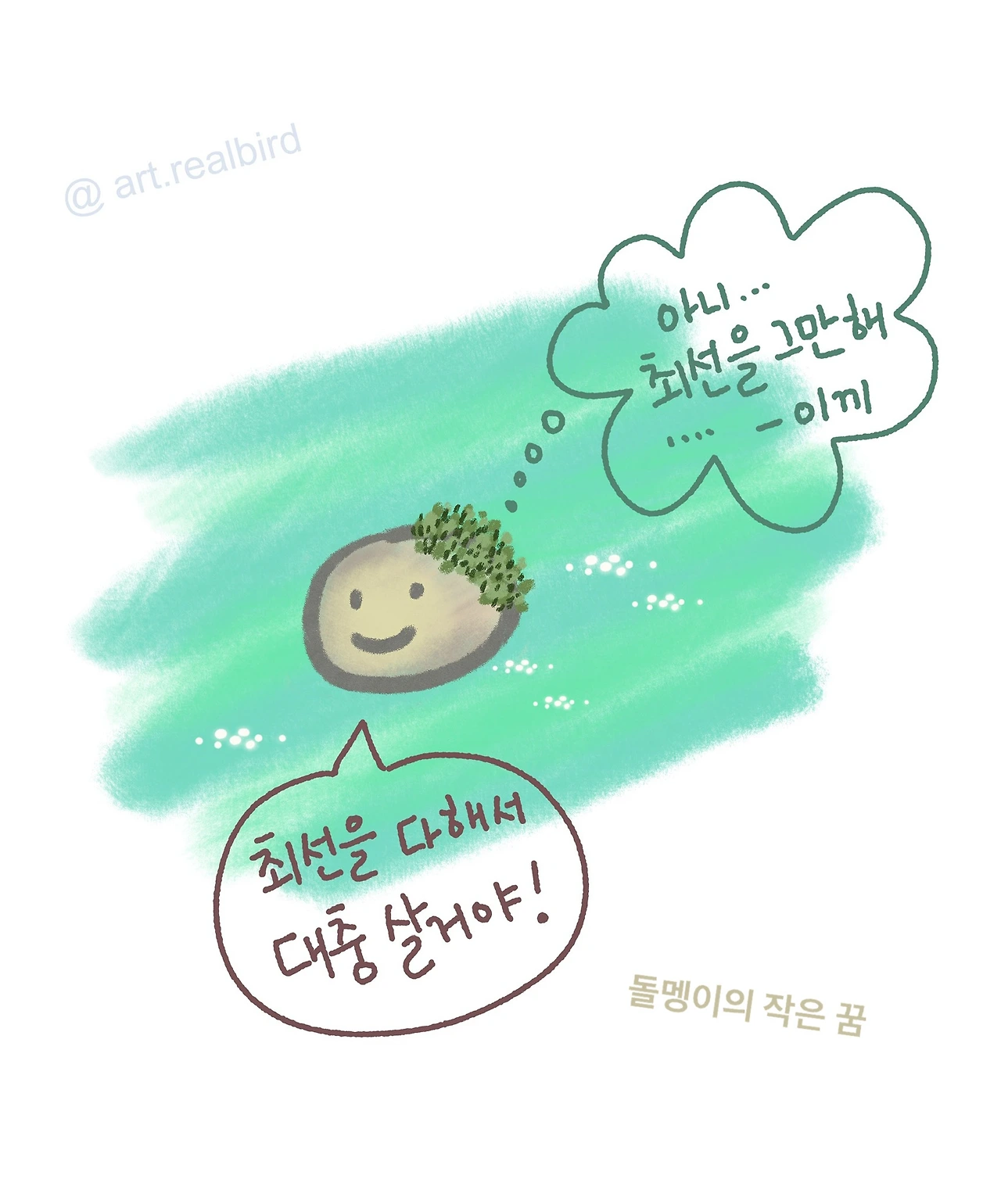 결코 스스로에게 “이게 열심히라고? 엄살 부리지 마. 더 노력해”라고 말해서는 안 된다. 세상은 달리는 데 나만 홀로 멈춰있다는 기분에 잠식되어서도 안된다. 더 잘 쉬려고 노력한다. 노력하다 보면 어느새 열심히 하고 있는 나를 본다. 그러면 숨을 크게 들이마시고, 다시금 대충 하려고 노력하는 것이다.