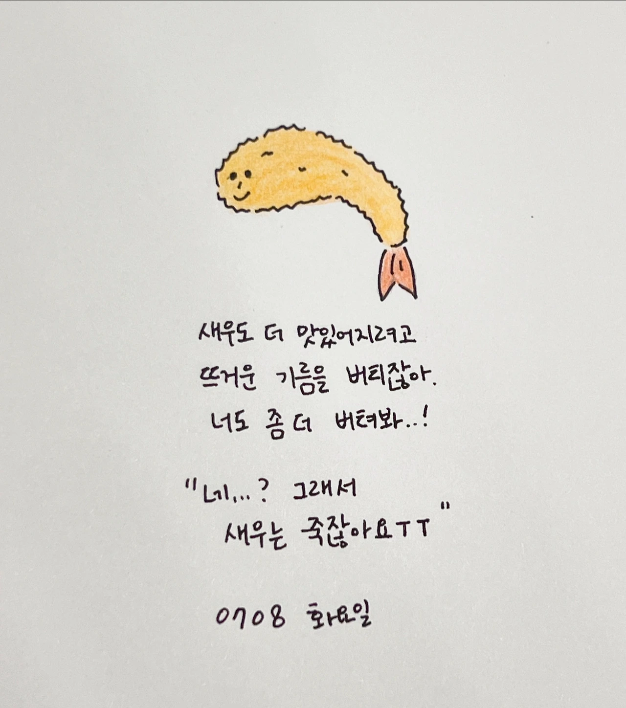 포실포실한 새우튀김을 먹으며 버티는 삶에 경이를 표하고, 나는 그저 맛있는 식사나 즐겨야지. 그게 내가 오늘 하루를 살아가는 법이다. 버티지 말자. 버티다 죽을 순 없으니까.