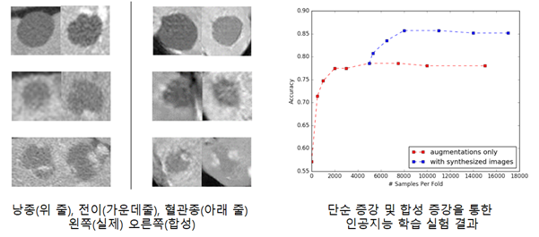 GAN을 활용하면 소량으로 수집 및 가공된 데이터 셋을 증강(Augmentation)하여 학습용 데이터 셋을 구축할 수 있다. Tel Aviv (이스라엘)에서 진행된 연구[4]에서는 간 병변(낭종, 전이, 혈관종) 진단 인공지능 모델 학습을 위하여 병원 및 의료기관과 밀접히 협력하여 6년 동안 간 병변 데이터를 수집하였고, 총 182장의 이미지를 얻었다. 182장, 이 겸손한 수량의 데이터만으로 인공지능 학습을 수행할 경우 편향(Bias), 과적합(Overfitting) 문제에 빠질 뿐만 아니라, 다양한 새로운 입력 데이터에 대한 강인한(Robust) 성능을 발휘하기 어렵다. 따라서 그들은 GAN을 활용하여 각 증상(낭종, 전이, 혈관종)의 특징을 보유한 새로운 수 만개의 데이터를 합성(Synthesis)하여 인공지능 모델 학습을 수행하였고, 성능 향상 결과(Sensitivity)를 얻었다. (증강 없음 : 57%, 단순 증강 : 78.6%, GAN 증강 : 85.7%)