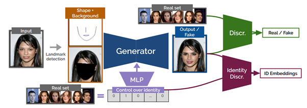 최근 얼굴 합성을 통한 비식별 처리 기술이 대두되고 있다. DeepFake와 같은 GAN 기반 이미지 합성 기술[6]은 가상의 얼굴을 원본 사진이나 영상에 겹치는 방식으로 개인정보를 비식별 처리한다. 기존 방법(Blur, Mosaic 등)과 달리 원본 인물의 표정(Expression), 자세(Pose) 등 R&D 연구에 유의미할 수 있는 주요 정보를 포함하되 새로운 인물로 대체하여 합성한다. 뮌헨 공과 대학교 연구진은 CVPR 2020에서 CIAGAN(GAN 기반 Conditional Identity Anonymization)[vii] 기술을 선보였다. 새로운 Identity의 인물을 생성한 후 합성하는 방식일 뿐만 아니라 주요 개인정보(나이, 성별, 신체 특징 등)에 대하여 선별적으로 조정 가능하도록 고안된 비식별 처리를 통하여 데이터의 활용성을 향상했다.