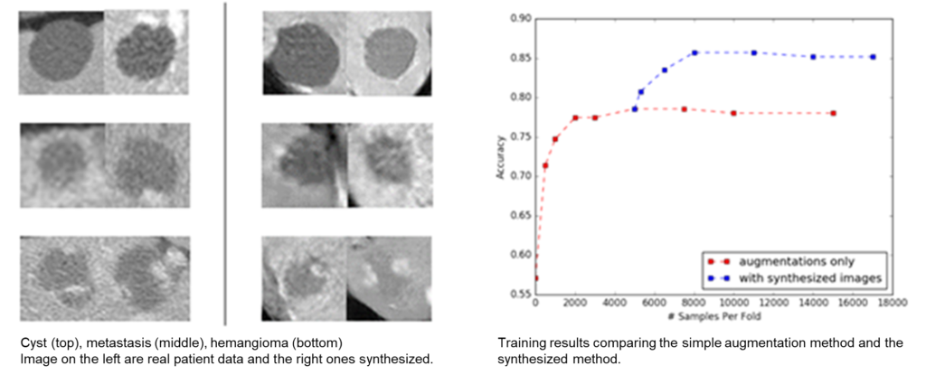 If an AI is trained with only this modest amount of data, not only will it fall into bias and overfitting problems, but it will also be difficult to exhibit robust performance against various new input data. Therefore, they trained it by synthesizing tens of thousands of new data with characteristics of each symptom (cyst, metastasis, hemangioma) using GAN, and obtained performance improvement results (sensitivity). (No Augmentation: 57%, Simple Augmentation: 78.6%, GAN Augmentation: 85.7%)