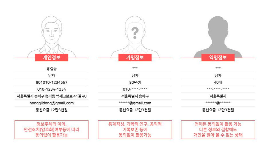 [그림 2] 개인정보, 가명 정보, 익명 정보 예시