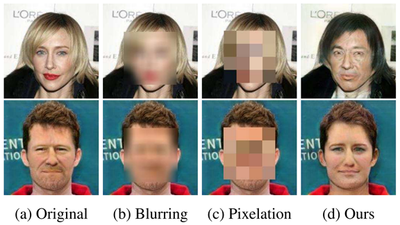 Tao Li는 컴퓨터 비전 딥러닝 분야 최고 수준의 학회 중 하나인 CVPR(컴퓨터 비전과 패턴 인식 콘퍼런스)에서 비식별 처리 방법인 AnonymousNet [4]을 발표했다. 기존 Blurring(흐려짐), Pixelation(모자이크) 외에 사실적인 대안을 합성하여 이미지를 비식별화하고 개인 정보 보호 여부가 측정 가능한 방법을 제안했다. 얼굴 특징 속성에 대하여 선별적으로 변환이 가능하고 각 속성이 제대로 비식별 처리가 되었는지 측정 가능하도록 설계했다. 얼굴 특징 속성은 나이, 성별, 피부색, 머릿결 타입, 표정, 수염 유무 등 실제 얼굴 특징뿐만 아니라 안경, 귀걸이 등 액세서리 착용 유무에 대해서 변환 가능하도록 고안됐다.