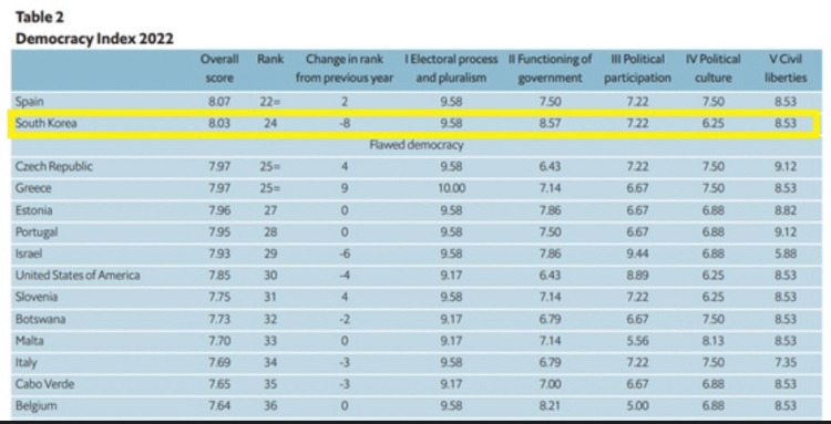 2월 1일 영국 <이코노미스트> 부설 경제분석기관인 이코노미스트 인텔리전스 유닛(EIU)이 <2022 글로벌 민주주의 지수> 보고서를 발표했는데, 한국의 민주주의 지수가 전 세계 167개국 중 24위라고 한다. 전년도 16위보다 8계단이나 떨어졌다. 평가 요소는 선거과정과 다원주의, 정부의 기능, 정치 참여, 정치 문화, 국민 자유 5개 항목으로, 우리나라는 정치문화에서 1.25점이나 크게 하향했다.