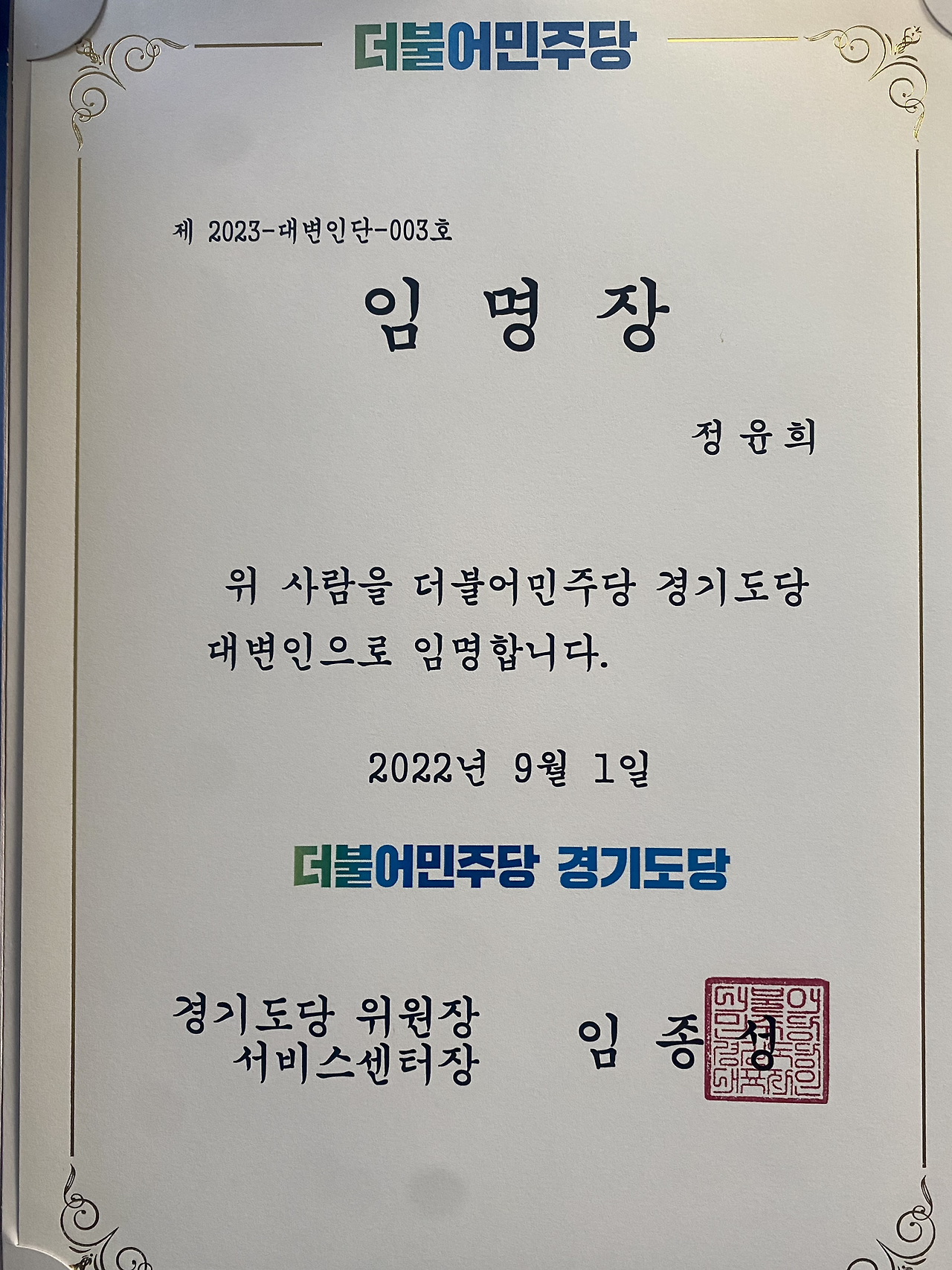 오늘 5월 31일 오전에 민주당 경기도당 대변인단 임명장 수여식에 참석해 임명장을 받았습니다.