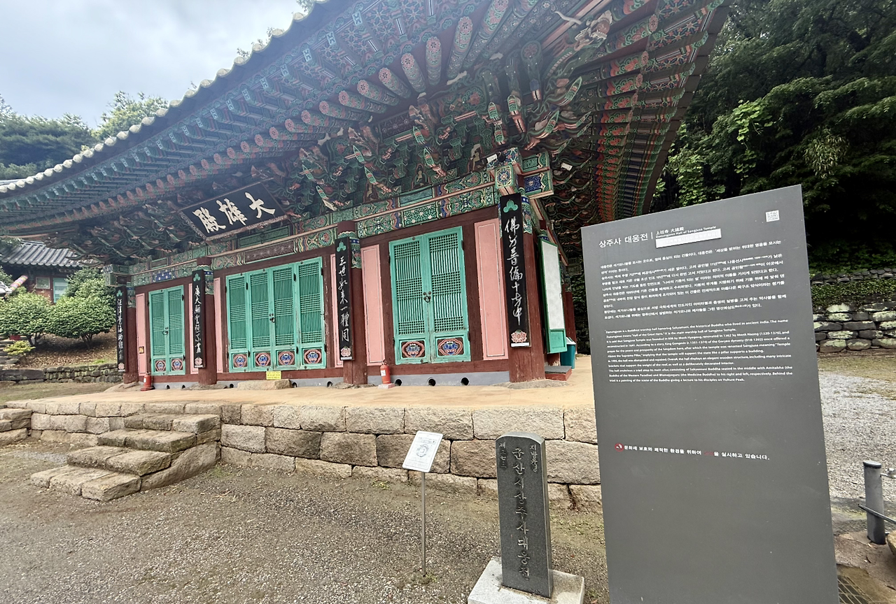 상주사 대웅전 앞에 표지석이 있어 자세히 들여다보니 오랜 역사가 깃든 절이었다. 상주사(上柱寺)는 군산시 서수면 취성산 동쪽 기슭에 있는 자리잡고 있다. 상주사 대웅전은 전북특별자치도 지방유형문화유산 제37호이다. 상주사는 백제 무왕 7년(606년)에 혜공(惠空)대사가 세운 절이고, 고려 공민왕 11년(1362년)에 나옹(懶翁) 대사가 낡은 부분을 헐고 새로 지은 것을 조선 인조 19년(1641)에 다시 고쳐 지었다고 한다. 고려 공민왕이 이곳에서 나라의 안녕을 비는 기도를 올린 인연으로 ‘나라의 기둥이 되는 절’이라는 의미의 上柱寺 라는 이름을 가지게 되었다고 한다.
